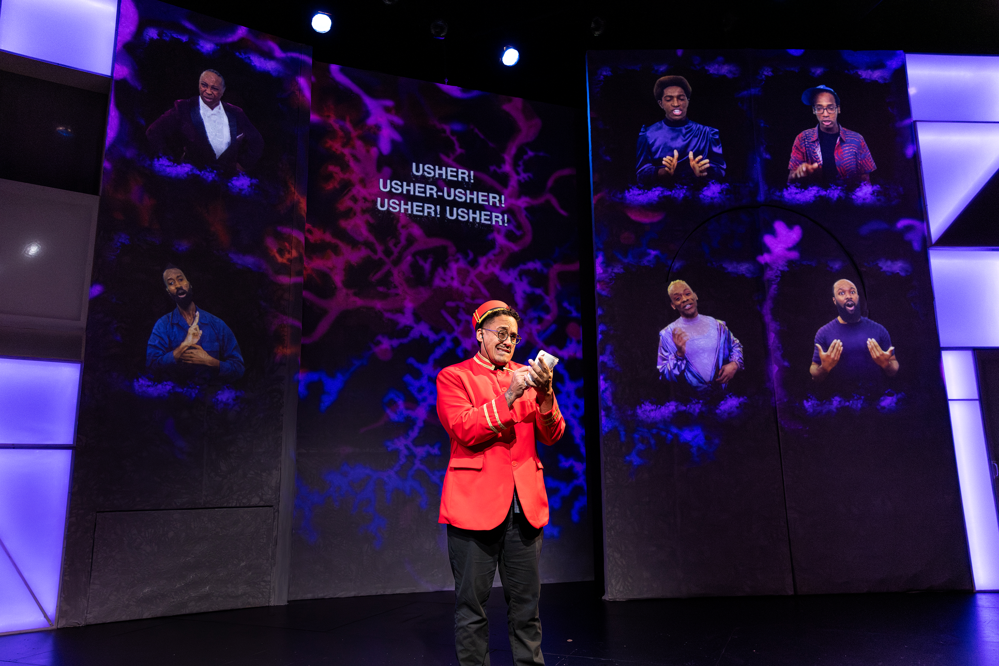 “The staging at Atlas...entails a complex range of technical cues, including video projections a la “Hollywood Squares” of characters who beam in to pester Usher (whether in vocal or sign language)...”